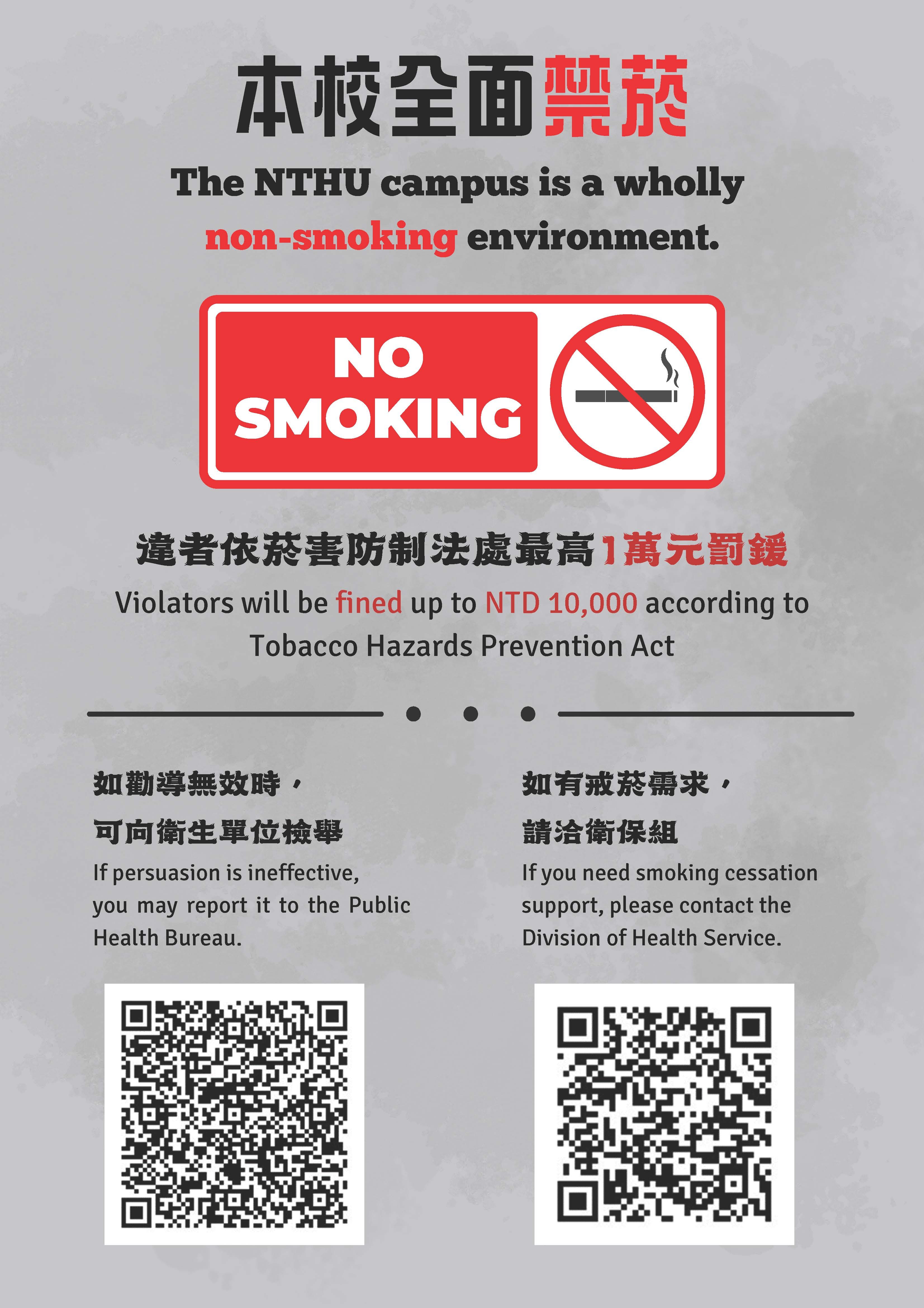The NTHU campus is a wholly non-smoking environment. Smoking is prohibited everywhere. He/She will be fined NT2,000 to NT10,000 if he/she is caught.