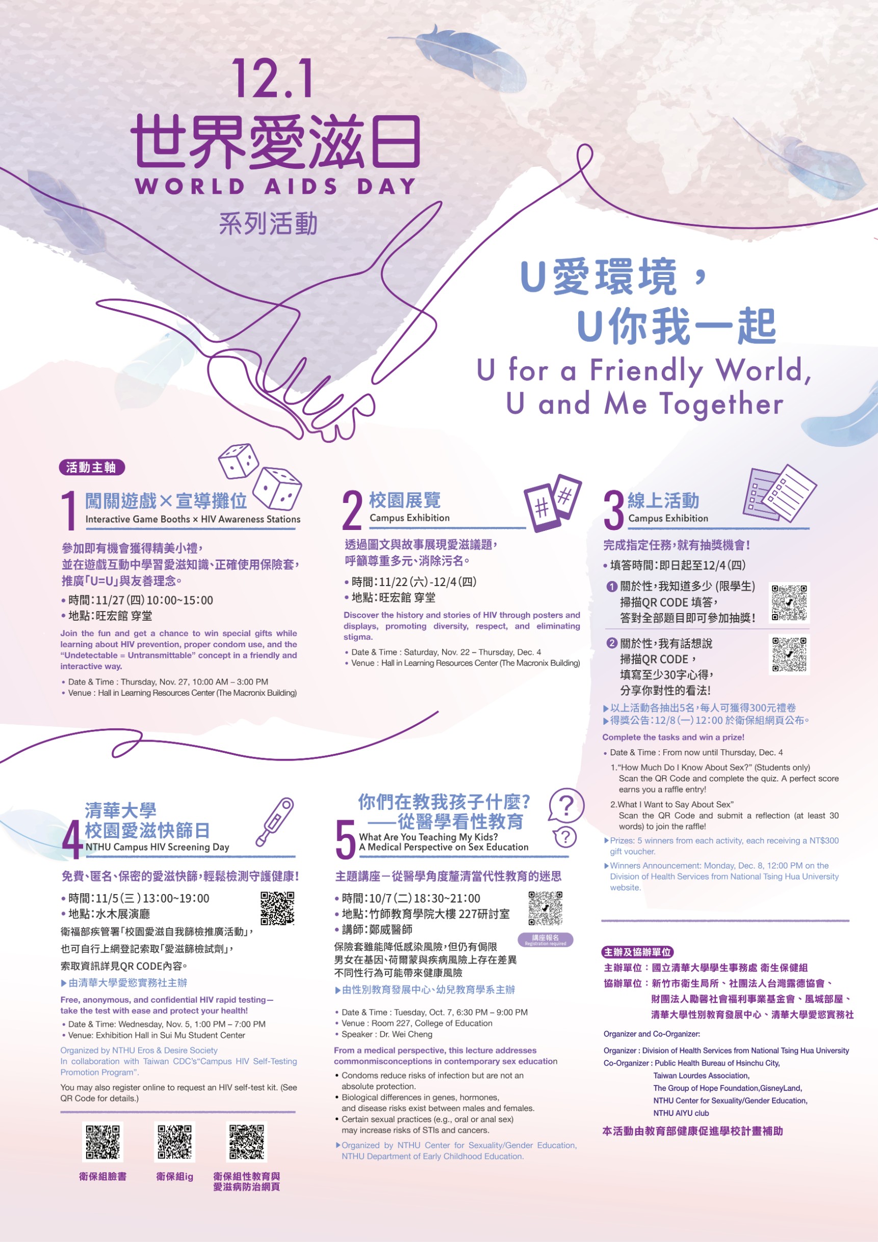 The World Health Organization (WHO) designates December 1st each year as World AIDS Day, hoping to arouse global attention to the AIDS issue, accept and care for people infected with AIDS, and call for global joint efforts to promote AIDS prevention and control. Public health policy, puts forward the appeal for AIDS human rights, and hopes that the whole world can work together to do more for those infected with AIDS. In recent years, the HIV/AIDS infected population in Taiwan has become younger, with those aged 15-34 accounting for 70% of the total infected population. Young people of this generation needs to pay more attention to this disease.